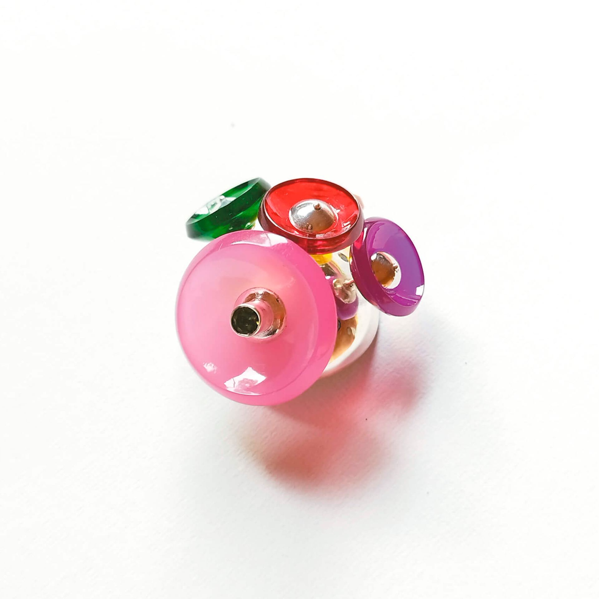 Each piece is an experiment in harmony: silver, acrylic, and gemstones merge to create compositions that celebrate light and movement.